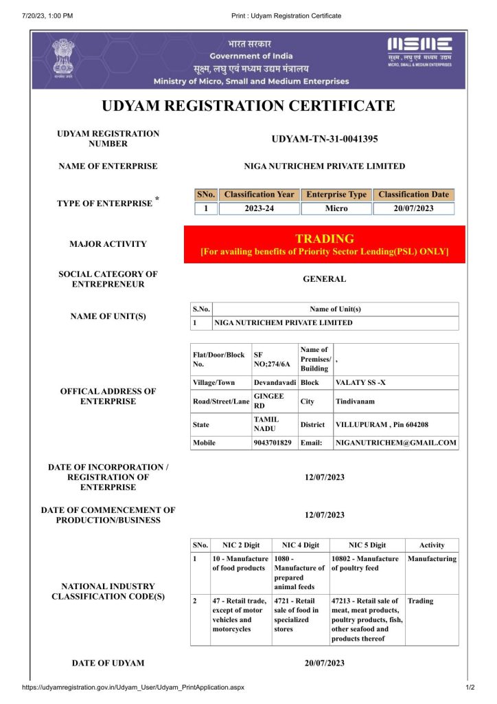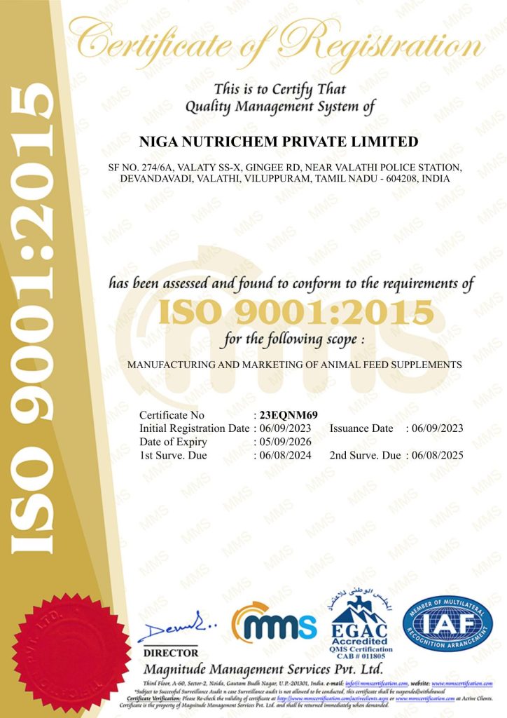 NIGA NUTRICHEM PRIVATE LIMITED is a highly professional Animal Feed Additives and supplements manufacturing company having our registered office located in Tamilnadu, India since 2020, we started our research activities in Aquaculture and Poultry through our parent concern called NIGA NUTRIBIOCHEM which was our first milestone in the industry. Initially we focused in Aquaculture and Livestock related International projects and later our expansion further improved through NIGA NUTRICHEM PRIVATE LIMITED.